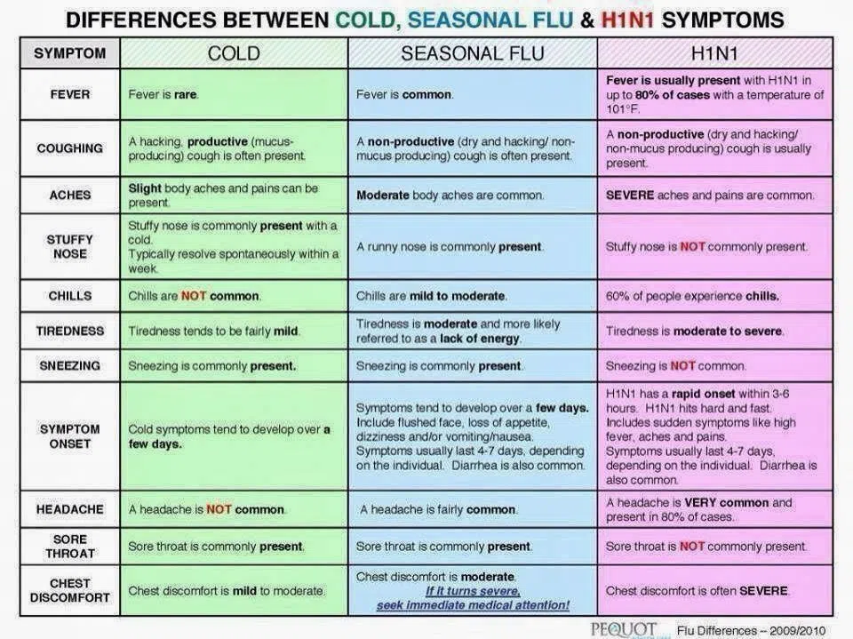Now the chart below goes into way more detail about whether you have a common cold, seasonal flu, or H1N1. Match your symptom to the ailment, and do a little self-diagnosis.