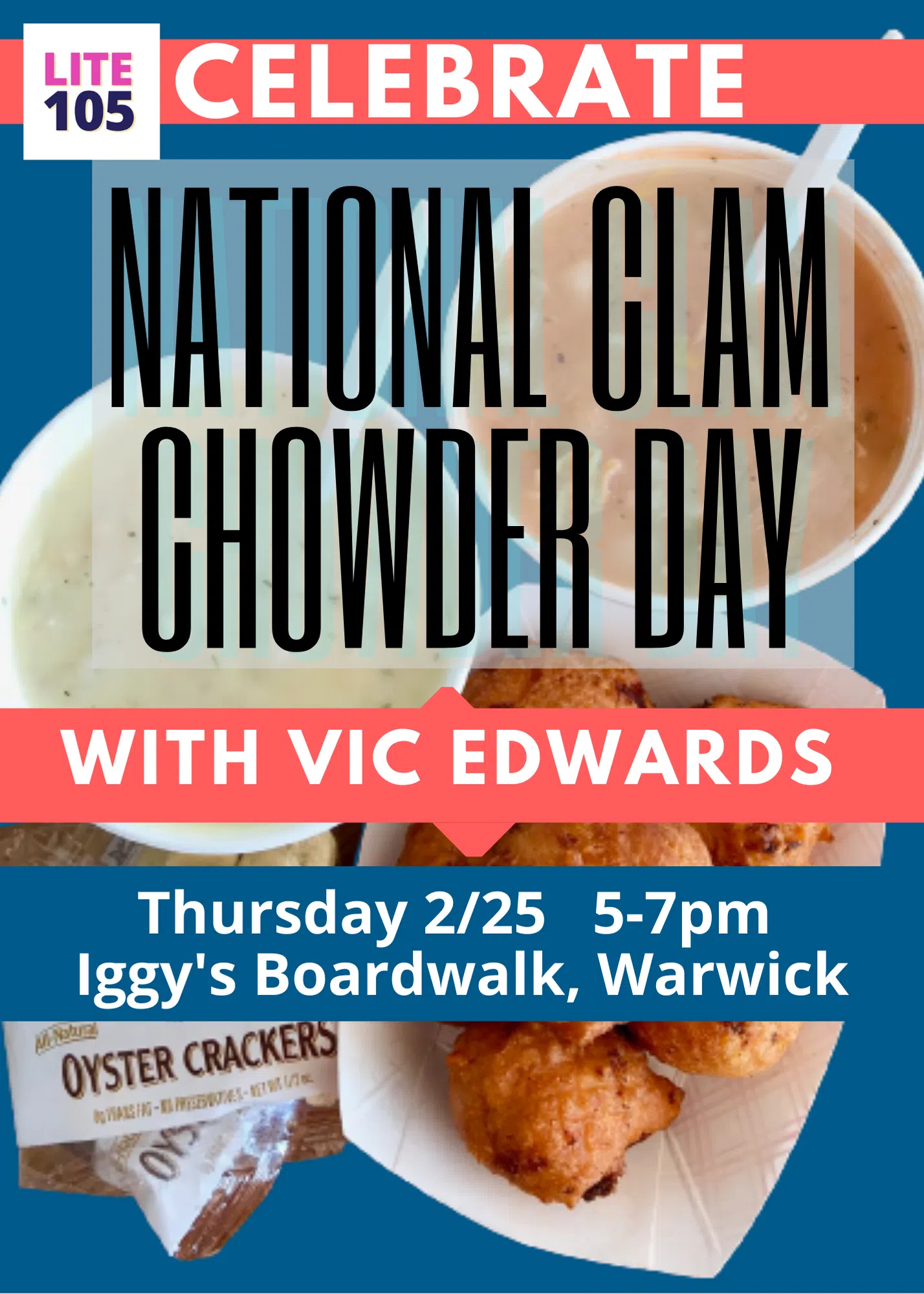 Lite 105’s Vic Edwards is going to be broadcasting LIVE at Iggy’s Boardwalk in Warwick from 5 to 7 this Thursday afternoon, February 25th… to celebrate National Clam Chowder Day!