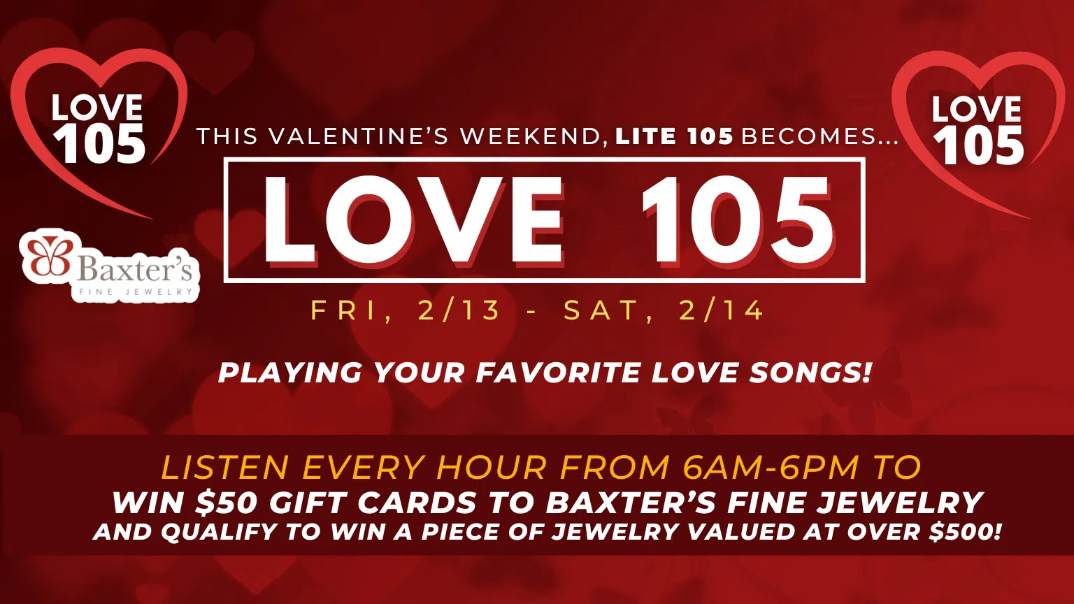 Get ready to swoon! This Friday and Saturday, Lite 105 is turning up the romance and transforming into LOVE 105! We’re playing your favorite love songs to set the perfect Valentine’s mood.